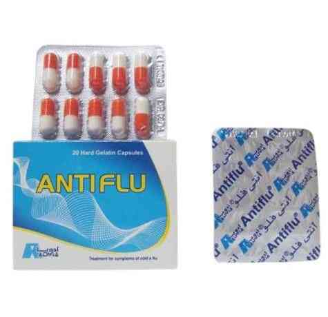 انتي فلو كبسول (Antiflu Capsule)أنتي فلو كبسول (Antiflu Capsule) هو دواء يُستخدم لتخفيف أعراض نزلات البرد والإنفلونزا، يحتوي على تركيبة فعالة تشمل إيبوبروفين، وهو مسكن للألم وخافض للحرارة ومضاد للالتهاب، وكلورفينيرامين كمضاد للهستامين لتقليل أعراض الحساسية مثل العطس وسيلان الأنف، وسودوافدرين كمزيل للاحتقان يساعد على فتح الممرات الأنفية، بالإضافة إلى كافيين الذي يُساعد في تقليل الشعور بالنعاس الناتج عن مضادات الحساسية ويُعزز من تأثير المسكن. دواعي استعمال أنتي فلويُستخدم أنتي فلو لتخفيف الصداع،