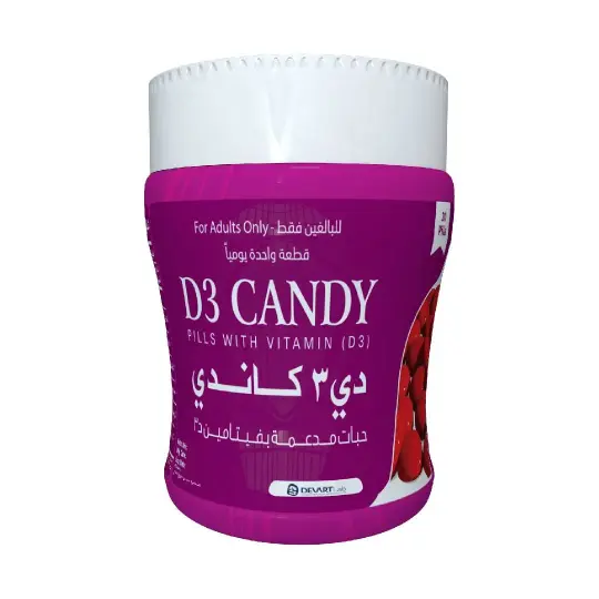 مكونات d3 candy للاطفال يحتوي d3 candy للاطفال على: فيتامين د3 (Vitamin D3): فيتامين أساسي لنمو الأطفال؛ يساهم في تنظيم مستويات الكالسيوم والفسفور لعظام صحية وأسنان قوية، كما أنه يدعم المناعة والعديد من الوظائف الحيوية الأخرى، ويتوفر في هذه القطع بتركيز 400 وحدة دولية. فوائد دي 3 كاندي للاطفال دي 3 كاندي للاطفال مكمل غذائي يساعد على: دعم وتعزيز المناعة في مواجهة حالات العدوى المختلفة. تنظيم مستوى الكالسيوم في الجسم. تقوية العظام والأسنان. الوقاية من هشاشة ولين العظام. الوقاية من حالات