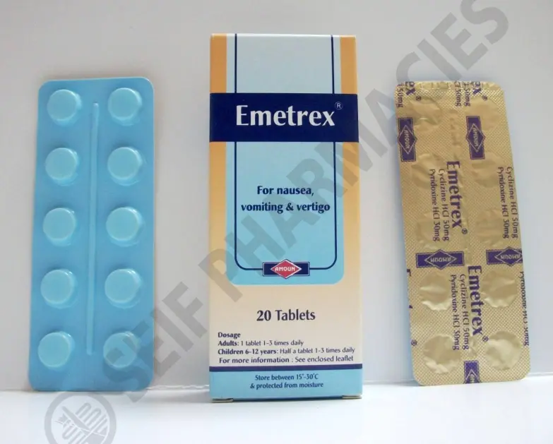 مكونات اميتركس اقراص emetrexسيكليزين هيدروكلوريد (Cyclizine hydrochloride): مادة فعالة في التأثير على بعض المراكز الخاصة بالمخ والمسؤولة عن تحفيز الحدوث بالغثيان أو القيء أو الدوار.بيروكسدين هيدروكلوريد (pyridoxine hydrochloride): مادة فعالة في تثبيط الشعور بالغثيان أو القيء في العديد من الحالات.برشام emetrex دواعي الاستعماليستعمل emetrex برشام فى الحالات التالية: علاج الغثيان والقيء الناتج عن دوار الحركة أثناء السفر.علاج القيء الناتج عن التهابات المعدة أو الجهاز الهضميتقليل الغثيان بعد العملي