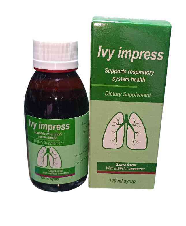 Cough Syrup mpress Its Enough with the Cough 100% Natural Works on dry & wet coughs Ivy impress Safe for Pregnants & Kids Helps reduce sore throat Ivy imp Suggested Dose : - Children up to 6 Yrs 2.5 ml 2 times daily - Children 6 to 11 Yrs 5 ml 2 times daily - Over 12 Yrs & adults 5 ml 3 times daily 1- لعلاج حالات الكحة الجافة الشديدة. 2- مهديء لحالات الكحة المصحوبة ببلغم. 3- موسع للشعب الهوائية لحالات ضيق التنفس. 4- مذيب للبلغم فيحسن وظائف الجهاز التنفسي. 5- مناسب للأطفال الصغار و للكبار. 6- مضاد للحساسية و الالتهاب ولا يسبب خمول أو نعاس. 7- مكونات طبيعية ومذاق لذيذ بطعم الجوافة.
