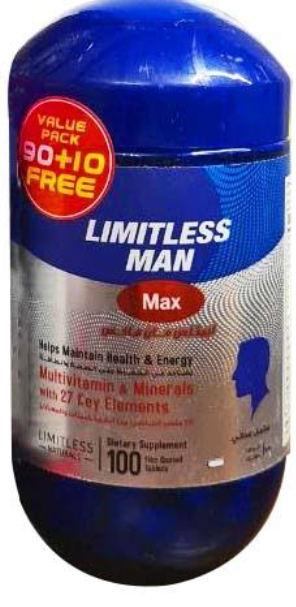 مكونات ليمتلس مان ماكس للرجال ( limitless man max)يحتوي ليمتلس مان ماكس على 27 عنصر متنوع من أهم الفيتامينات والمعادن التي يحتاج إليها الجسم، ومنها: فيتامين أ (Vitamin A) وفيتامين هـ (Vitamin E) وفيتامين ك (Vitamin K).فيتامينات ب (Vitamin B): وتشمل على فيتامينات ب1 وب2 وب6 وب12. حمض الفوليك (Folic Acid). البيوتين (Biotin). الحديد (Iron)الزنك (Zinc).الكالسيوم (Calcium) والماغنيسيوم (Magnesium).الفوسفور (Phosphorus) واليود (Iodine) السيلينيوم (Selenium) والنحاس (Copper).المنجنيز (Manga