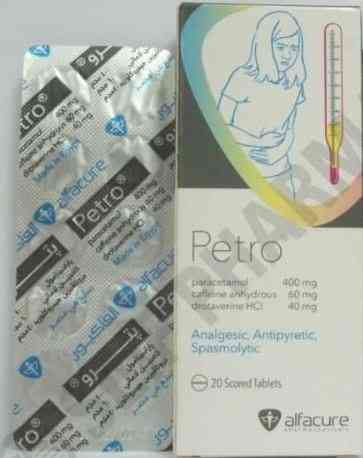 يعتبر دواء بترو من المسكنات وخوافض الحرارة القوية و يحتوي كل قرص على: دروتافيرين هيدروكلوريد 40 مجم. اسيتامينوفين (باراسيتامول) 400 مجم. كافيين 60 مجم.يعمل الباراسيتامول عن طريق تخفيف الألم وتقليل ارتفاع درجة الحرارة والحمى وتعمل :مادة الكافيين على تأثير تخفيف الآلام للمنتج ، أما دروتافيرين هو دواء مضاد للتشنج ، يستخدم لتعزيز اتساع عنق الرحم أثناء الولادة. الجرعة وطريقة الاستخدام: جرعة البالغين: من قرص الى قرصين 3 مرات يوميا. جرعة الاطفال: قرص 3 مرات يوميا. جرعة كبار السن: قرصين