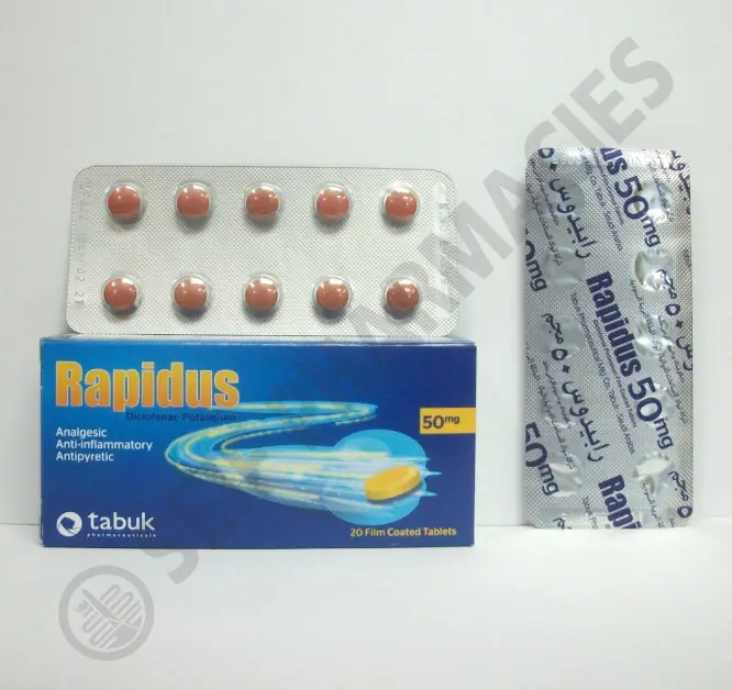 مكونات دواء رابيدوس 50 ملجم يحتوي كل قرص على 50 ملغ من مادة ديكلوفيناك بوتاسيوم التى تعمل كمسكن للألم وخافض للحرارة ومضاد للالتهابات دواعي استعمال رابيدوس 50 rapidusيستخدم دواء رابيدوس ٥٠ كمسكن للألم ومضاد للالتهابات فى الحالات الآتية : التهاب المفاصل الروماتويدي هشاشة العظام آلام أسفل الظهر نوبات الصداع النصفي آلام العضلات والعظام الحادة والصدمات التهاب الأوتار والالتواء تخفيف آلام الكسور النقرس الحاد جرعة رابيدوس اقراص قرص مرتين أو ثلاث مرات فى اليوميجب ألا