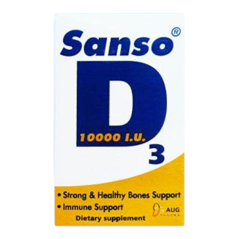 مكونات سانسو د٣يحتوي سانسو د٣ ١٠٠٠٠ على:كوليكالسيفيرول (Colecalciferol): أحد أشكال فيتامين د، والذي يساعد الجسم على تنظيم مستوى الكالسيوم والفوسفور بحيث يحافظ على صحة العظام وتقوية الأسنان.دواعي استعمال سانسو د٣يعالج حالات نقص فيتامين د في الجسم وما ينتج عنها من أعراض.يحسن امتصاص الكالسيوم.يقوي العظام والأسنان.يقي من هشاشة ولين العظام.ينظم تقلصات العضلات.يحسن من إنتاج الطاقة اللازمة لعمل الجسم.يعزز قدرة المناعة على مواجهة العدوى.جرعة سانسو د٣ 10000يجب استشارة الطبيب قبل استعمال سانسو فيتامين د