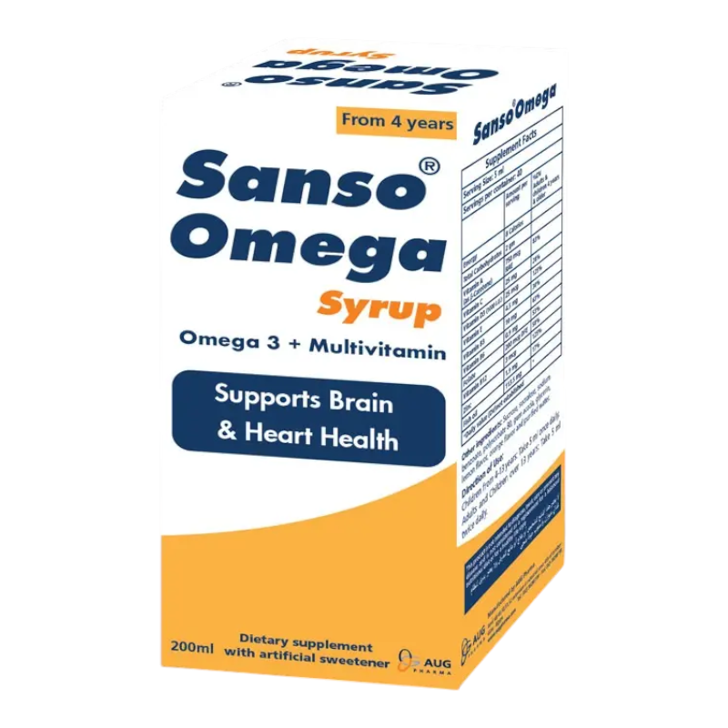 .product-details p {font-size: 14px; font-weight: 300; line-height: 1.7; color: #1b5e20; margin-bottom: 14px;} .product-details h3 {font-size: 21px; font-weight: 700; color: #e65100; margin-bottom: 8px;} الوصف شراب سانسو أوميغا هو مصدر غني للأحماض الدهنية الأساسية (EPA و DHA) المصممة خصيصاً للأطفال. أوميغا 3 هي لبنات بناء حيوية للدماغ والشبكية. يدعم التناول المنتظم التطور المعرفي، ويحسن التركيز وقدرات التعلم، ويعزز حدة البصر. الشراب منكه لضمان قبول سهل من قبل الأطفال. دواعي الاستعمال مكمل غذائي لدعم التطور المعرفي، والذاكرة، والتركيز لدى الأطفال. مفيد للأطفال المصابين بفرط الحركة ونقص الانتباه (داعم). يدعم الرؤية الصحية والنمو العام. الفوائد يعزز طاقة الدماغ والتركيز. يدعم نمو العين الصحي. يعزز القدرة على التعلم. طعم لذيذ يخفي طعم السمك. المكونات زيت سمك (غني بأوميغا 3: DHA، EPA). قد يحتوي على فيتامينات هـ أو د (تحقق من الملصق). طريقة الاستخدام الأطفال: ملعقة صغيرة يومياً أو حسب التوجيهات. يرج جيداً. يمكن خلطه بالعصير إذا لزم الأمر. تحذيرات واحتياطات استشر الطبيب إذا كان الطفل يعاني من اضطرابات النزيف أو حساسية السمك. لا تتجاوز الجرعة الموصى بها. التخزين يحفظ في مكان بارد وجاف. يبرد بعد الفتح. حجم العبوة 200 مل شراب.