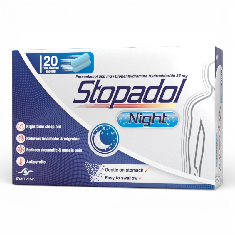 .product-details p {font-size: 14px; font-weight: 300; line-height: 1.7; color: #1b5e20; margin-bottom: 14px;} .product-details h3 {font-size: 21px; font-weight: 700; color: #e65100; margin-bottom: 8px;} الوصف يقدم ستوبادول نايت حلاً للألم الليلي الذي يزعج النوم. يحتوي على الباراسيتامول لتقليل الألم والحمى، وديفينهيدرامين هيدروكلوريد، وهو مضاد للهستامين بخصائص مهدئة تسبب النعاس. يساعد هذا المزيج المرضى على النوم بشكل أسرع والبقاء نائمين عن طريق إدارة الألم. دواعي الاستعمال العلاج قصير الأمد لألم وقت النوم مثل الألم الروماتيزمي والعضلي، وآلام الظهر، والألم العصبي، وألم الأسنان، أو أعراض البرد والإنفلونزا المسببة للأرق. المادة الفعالة وآلية العمل باراسيتامول 500 مجم: مسكن. ديفينهيدرامين هيدروكلوريد 25 مجم: مضاد هستامين مهدئ يعزز النوم وقد يعزز التأثير المسكن. الفوائد يخفف الألم بفعالية. يعزز النوم المريح. يساعد في كسر حلقة الألم والأرق. المكونات باراسيتامول 500 مجم، ديفينهيدرامين هيدروكلوريد 25 مجم. طريقة الاستخدام تناول قرصين قبل النوم بـ 20 دقيقة. لا تتناول منتجات أخرى تحتوي على الباراسيتامول خلال 4 ساعات. لا تتجاوز الجرعة المذكورة. تحذيرات واحتياطات قد يسبب نعاساً شديداً؛ لا تقد السيارة أو تشغل الآلات. تجنب الكحول. يمنع في الجلوكوما وتضخم البروستاتا. التخزين يحفظ في درجة حرارة أقل من 30 درجة مئوية. حجم العبوة 20 قرص.