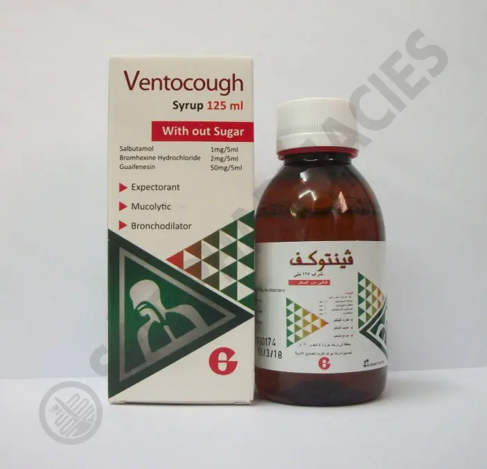 دواء فينتوكف شراب دواء موسع للشعب وطارد للبلغم للأطفال. الجرعة وطريقة الاستخدام: الكبار والأطفال أكبر من سن 12 سنة : 10 ملل (ملعقتان) لمدة ثلالث مرات في اليوم.الأطفال من سن 6-12 سنة: 5ملل (ملعقة واحدة) تكرر ثلاث مرات يوميا.الأطفال من سن 2_5 : 2.5 مللي (نصف ملعقة) تكرر لمدة ثلاث مرات يوميا. دواعي الاستعمال: الفينتوكف يستخدم في علاج السعال الذي يسببه إضطرابات الجهاز التنفسي ،والتهابات الشعب الهوائية الحاد ، والتهابات الشعب الهوائية المزمن والالتهاب الرئوي والربو.